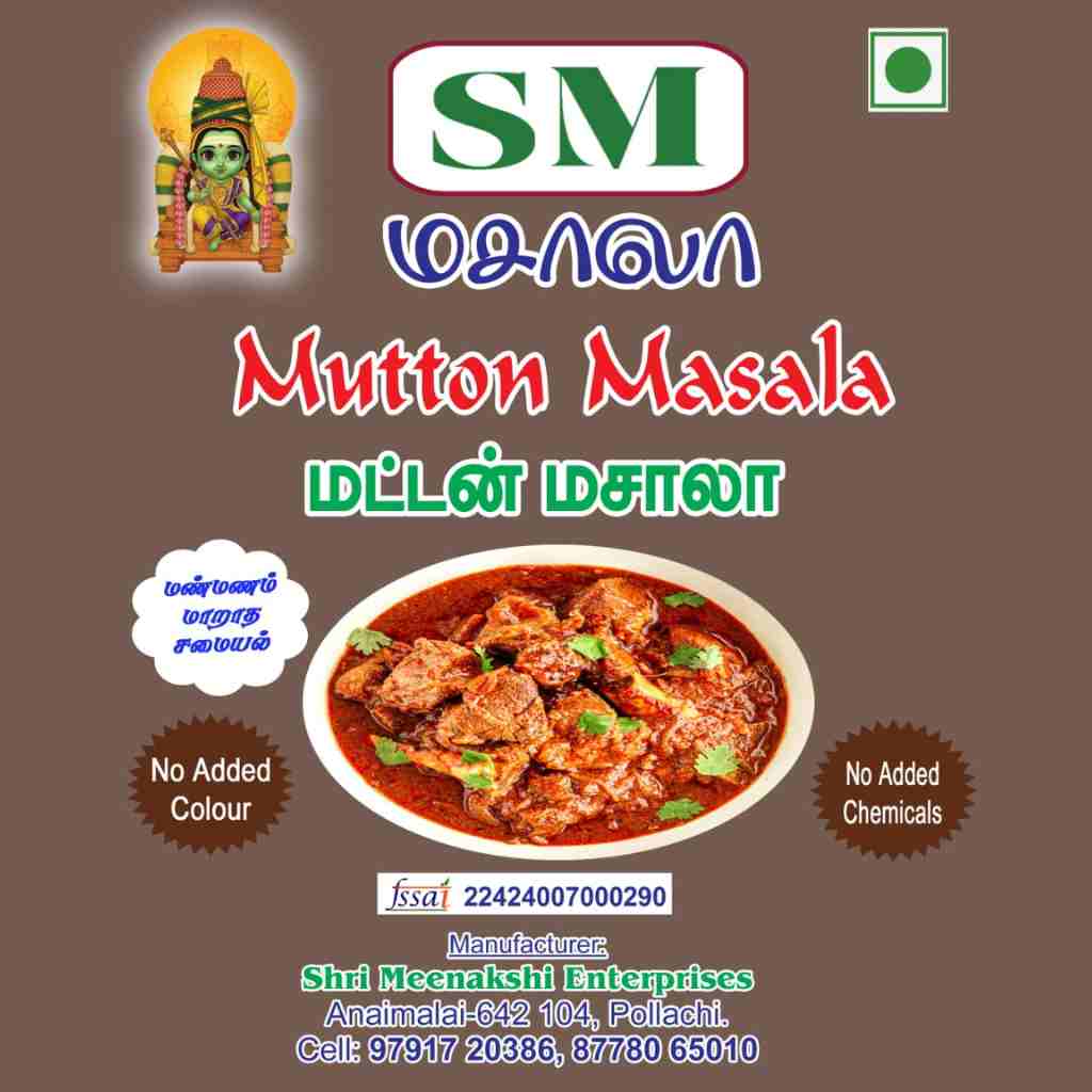 SM Mutton Masala is a premium blend of handpicked spices crafted to enhance the flavour of mutton dishes. Its rich aroma and balanced spice profile make it ideal for traditional South Indian mutton curry, gravy, and roast preparations.